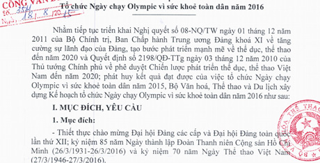 Bộ Văn hóa, Thể thao và Du lịch xây dựng kế hoạch yêu cầu các tỉnh, thành phố trực thuộc trung ương tổ chức Ngày chạy Olympic vì sức khỏe toàn dân năm 2016 tại các xã phường, thị trấn trên toàn quốc; các cơ quan đoàn thể, doanh nghiệp, trường học, quân đội, công an,...tham gia hưởng ứng Ngày chạy Olympic vì sức khỏe toàn dân năm 2016.
