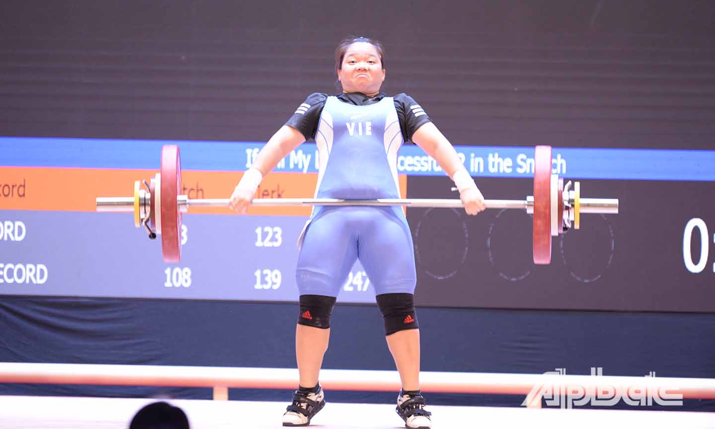 | Dù rất cố gắng nhưng VĐV Lâm Thị Mỹ Lê không thể đoạt được huy chương ở hạng cân 71 kg nữ. |