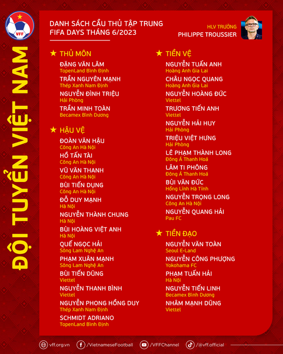 Ngày 2-6, HLV trưởng Philippe Troussier đã chính thức công bố danh sách tập trung đội tuyển Việt Nam dịp FIFA Days tháng 6/2023. Qua đó sẽ có 33 cầu thủ được triệu tập, trong đó có 2 chân sút vốn dự bị nhiều ở nước ngoài trong thời gian qua là Quang Hải và Công Phượng.