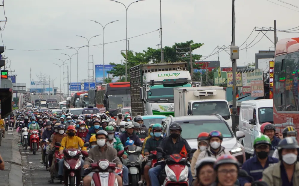 Dòng xe ùn ứ trên quốc lộ 1 đoạn qua cầu Bình Điền và nút giao Bình Thuận. Ảnh: Giang Anh