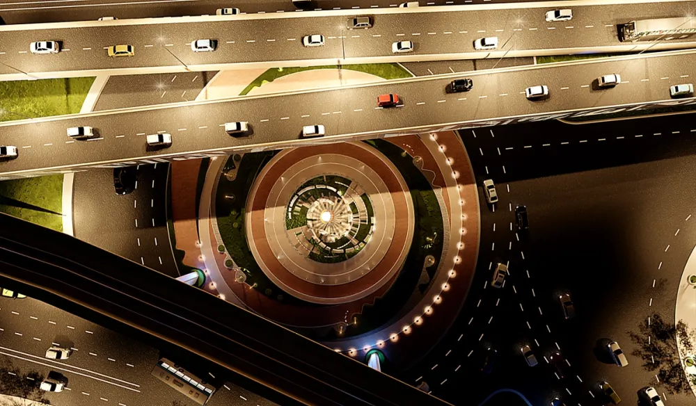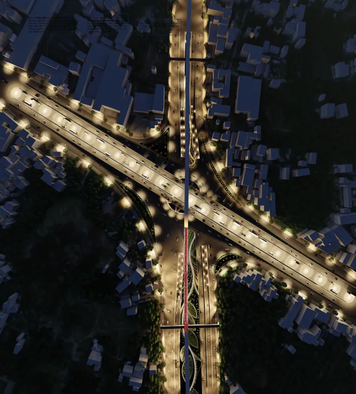 Vòng xoay phía dưới nút giao được thiết kế các hạng mục mỹ thuật nhằm tăng mỹ quan và tăng tính nhận diện. Trong đó, điểm nhấn ở khu vực này sẽ có trụ phát sáng, mang hình tượng vương miện của thủy tổ Kinh Dương Vương.