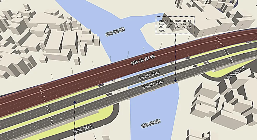 Phối cảnh cầu Bình Điền và phương án thiết kế cơ sở ban đầu trên tuyến. Công trình sẽ xây thêm một cầu mới, giúp mở rộng làn đường cho xe chạy; bố trí đường cho người khuyết tật. Cầu cũng bổ sung cảnh quan, chiếu sáng mỹ thuật nhằm tạo điểm nhấn cho khu vực về đêm.