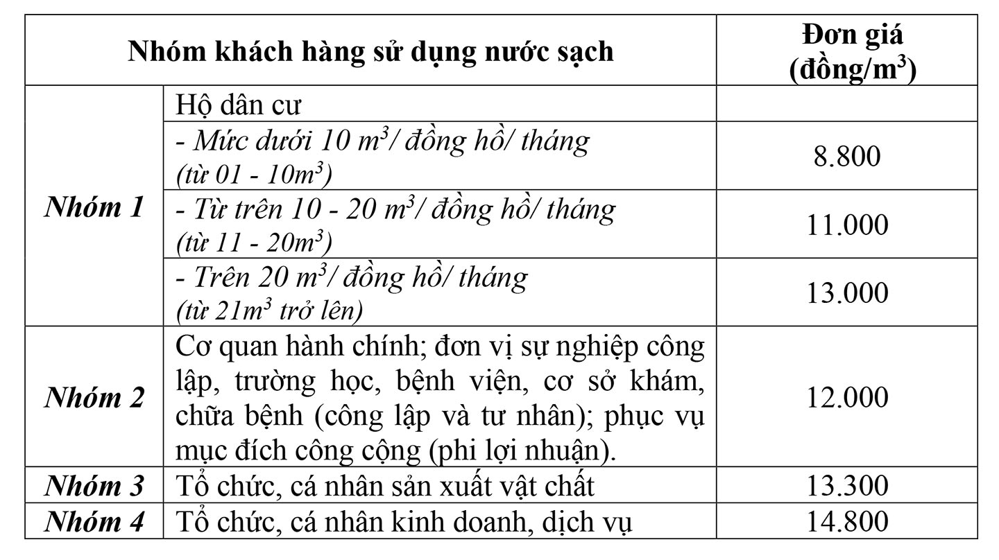Giá nước sạch sinh hoạt nêu trên đã bao gồm thuế giá trị gia tăng 5%, chưa bao gồm phí bảo vệ môi trường đối với nước thải sinh hoạt.