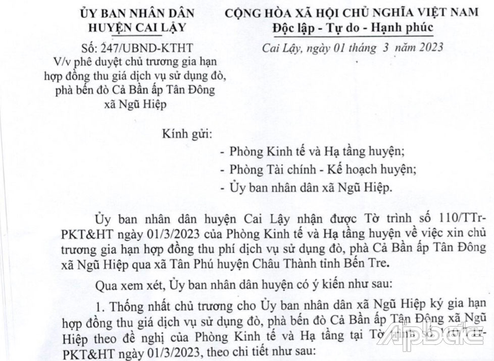 Theo đó, vào ngày 1-3-2023, UBND huyện Cai Lậy đã có văn bản phê duyệt chủ trương gia hạn hợp đồng thu giá dịch vụ sử dụng đò phà bến phà Cây Dương (Cả Bần) ấp Tân Đông, xã Ngũ Hiệp. Ngoài ra, huyện thống nhất chủ trương UBND xã Ngũ Hiệp ký gia hạn hợp đồng với đơn vị khai thác, sử dụng bến phà trên; hoàn thành việc đấu giá khai thác bến trước ngày 31-5.