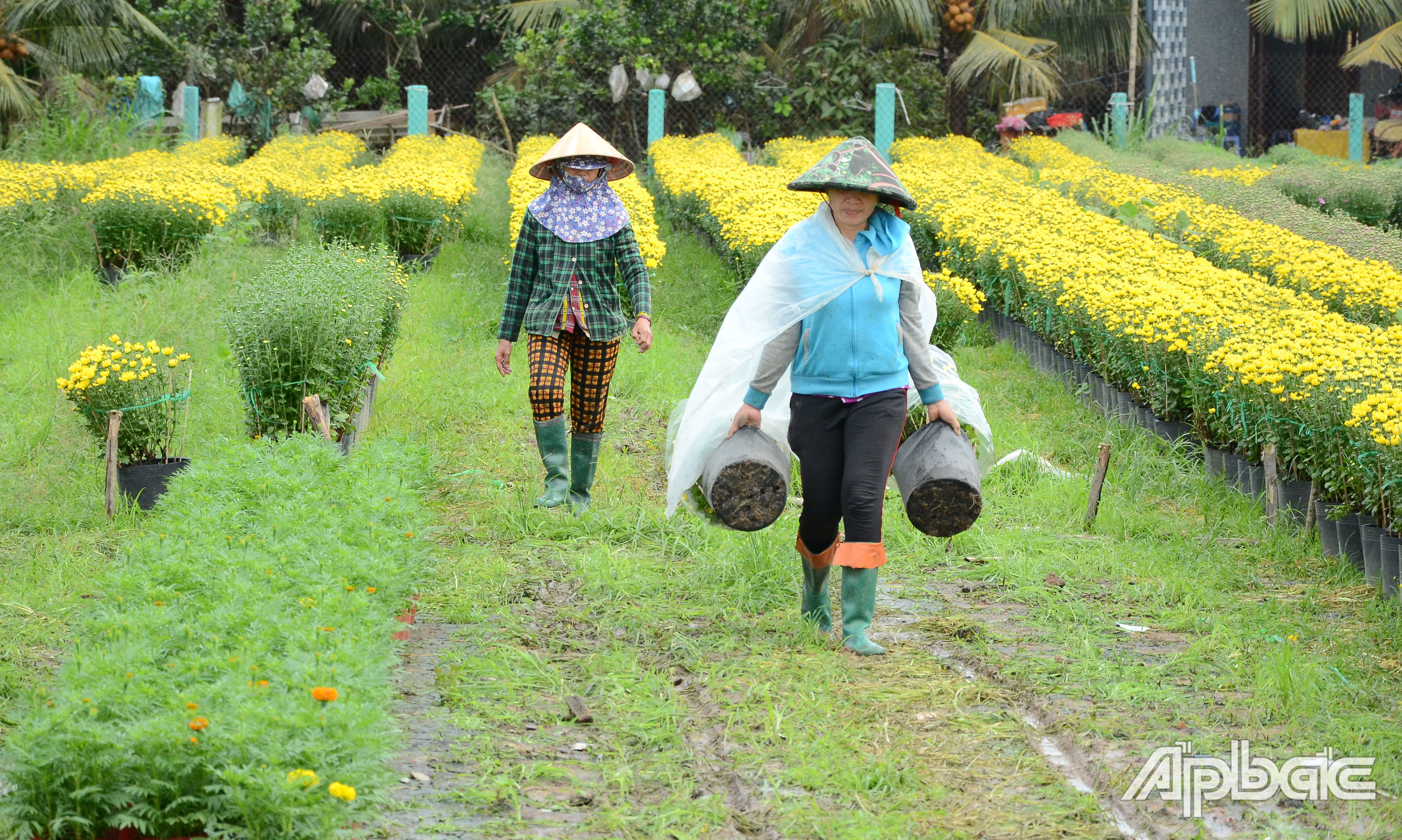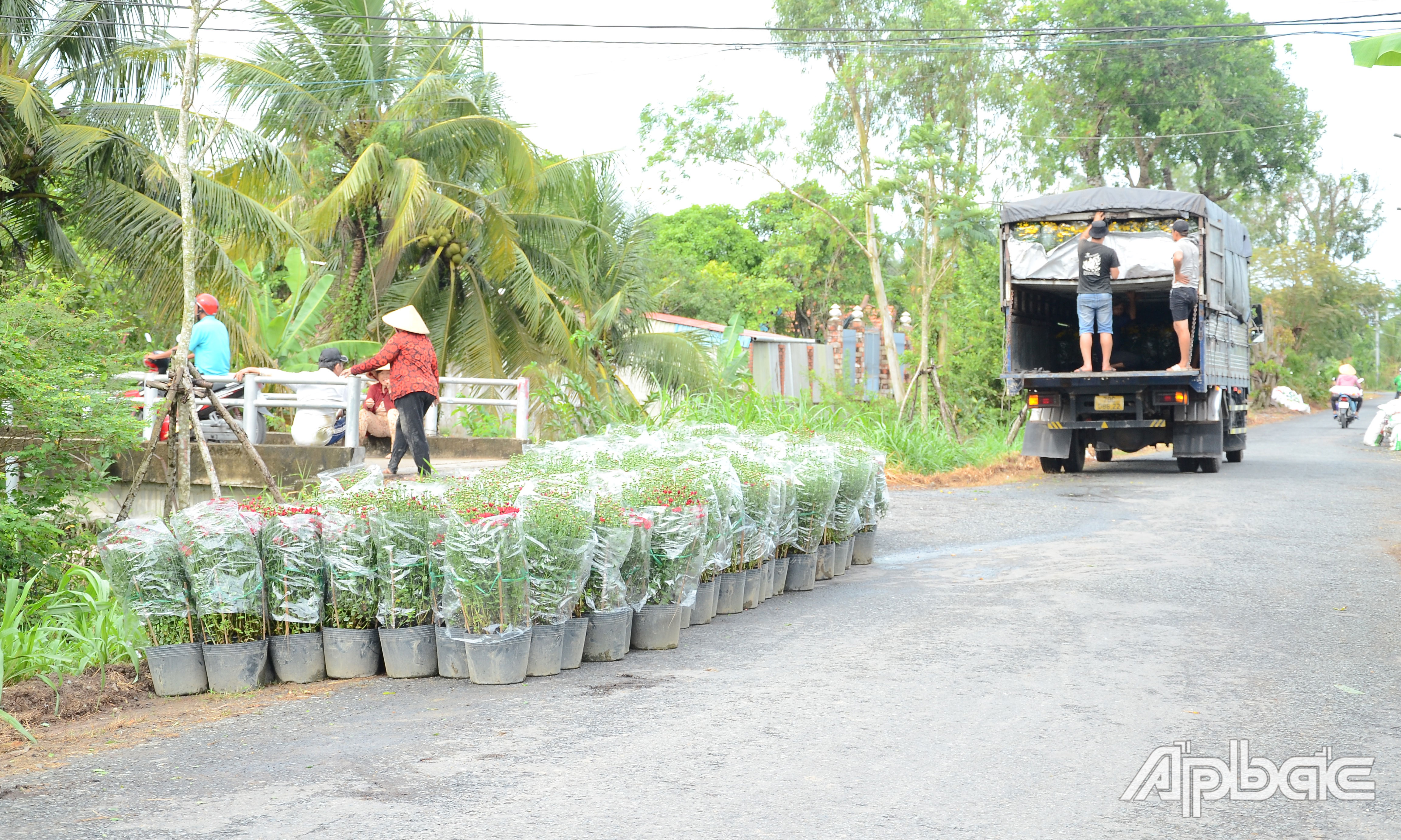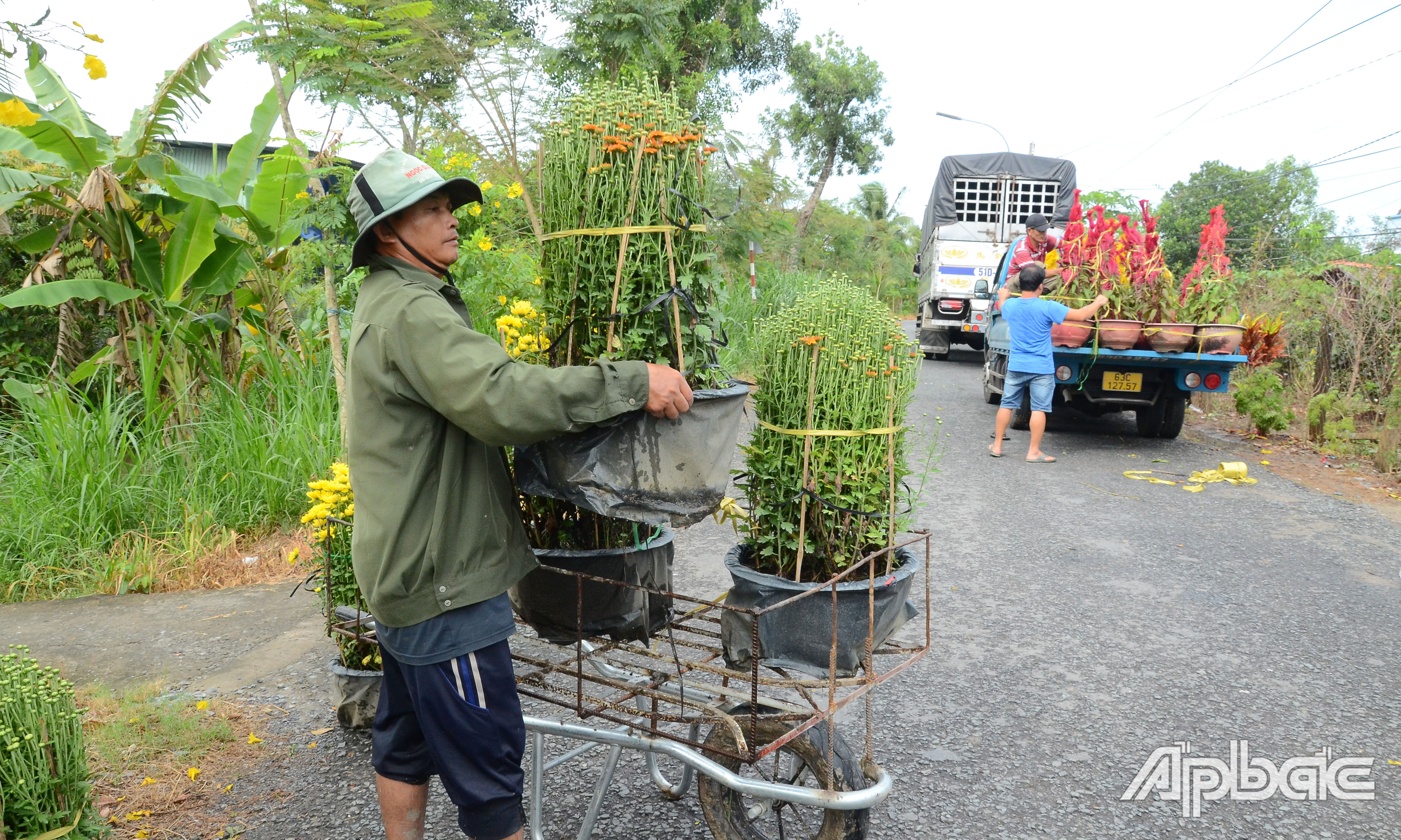 Ghi nhận tại Làng hoa Mỹ Phong (xã Mỹ Phong, TP. Mỹ Tho) vào chiều 10-1, có rất đông thương lái đến lấy hoa tết.