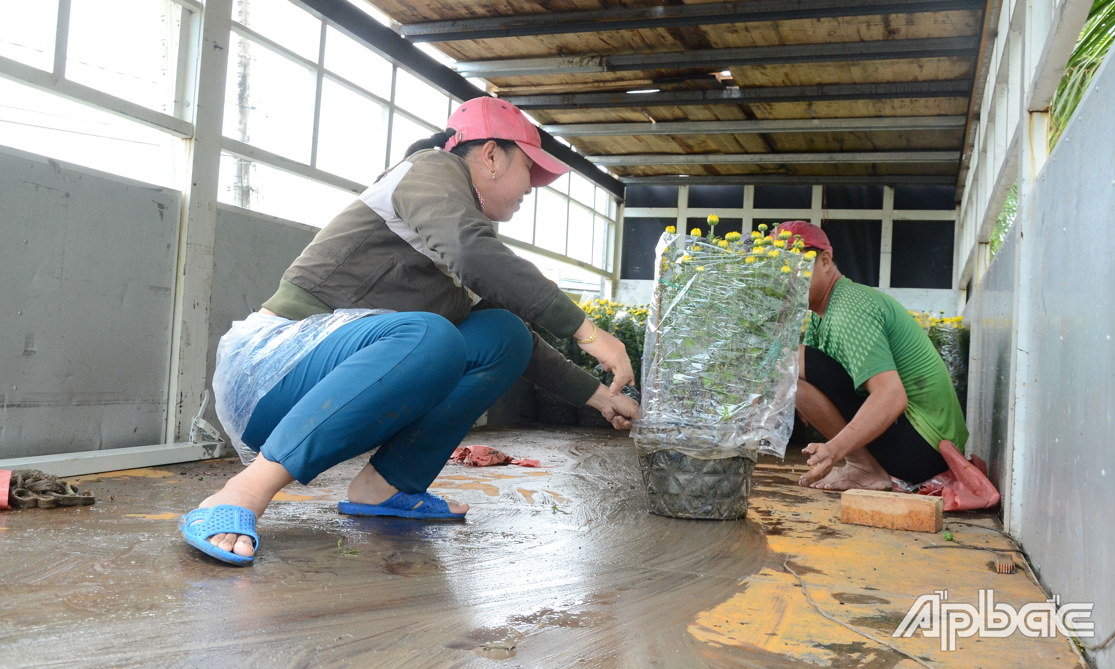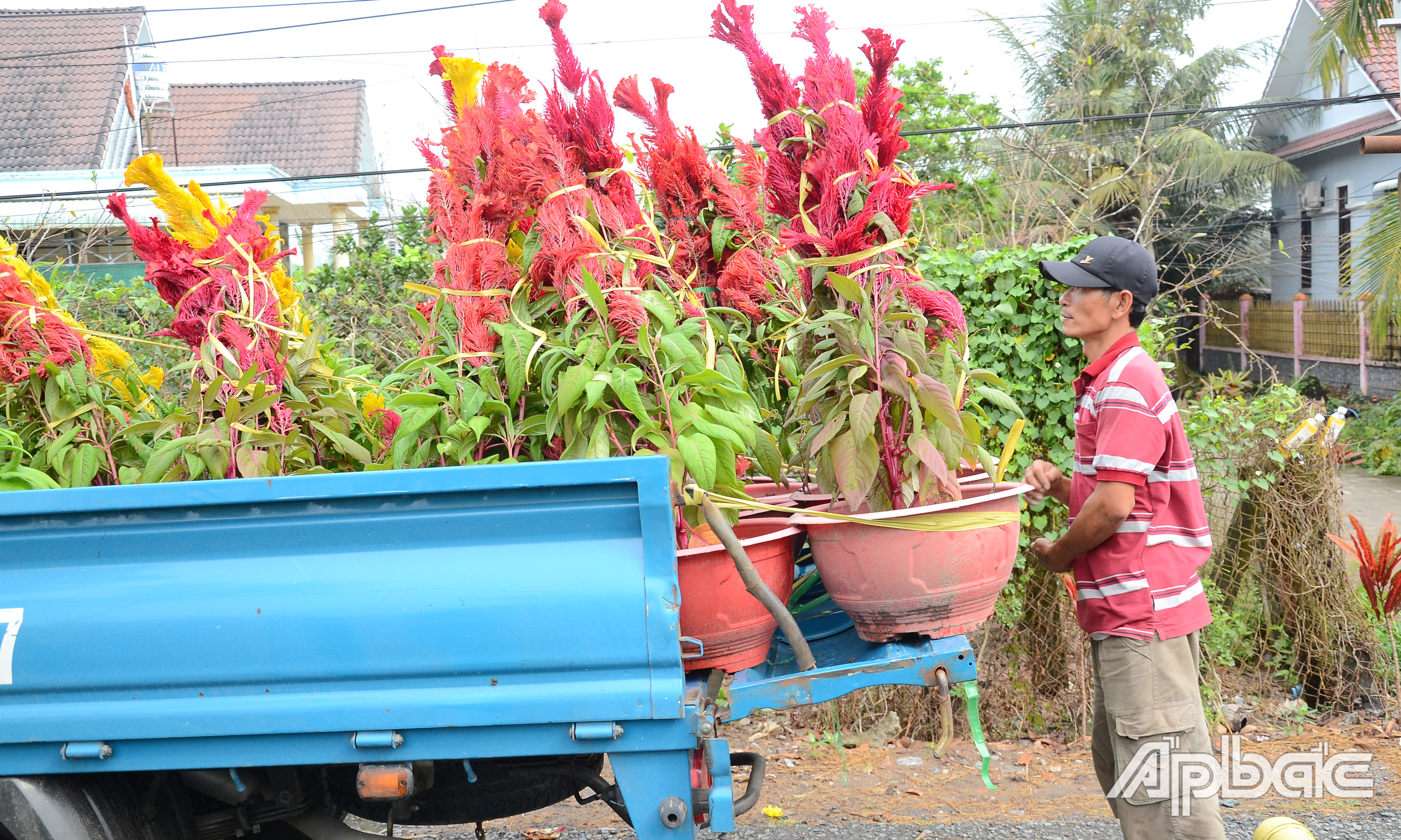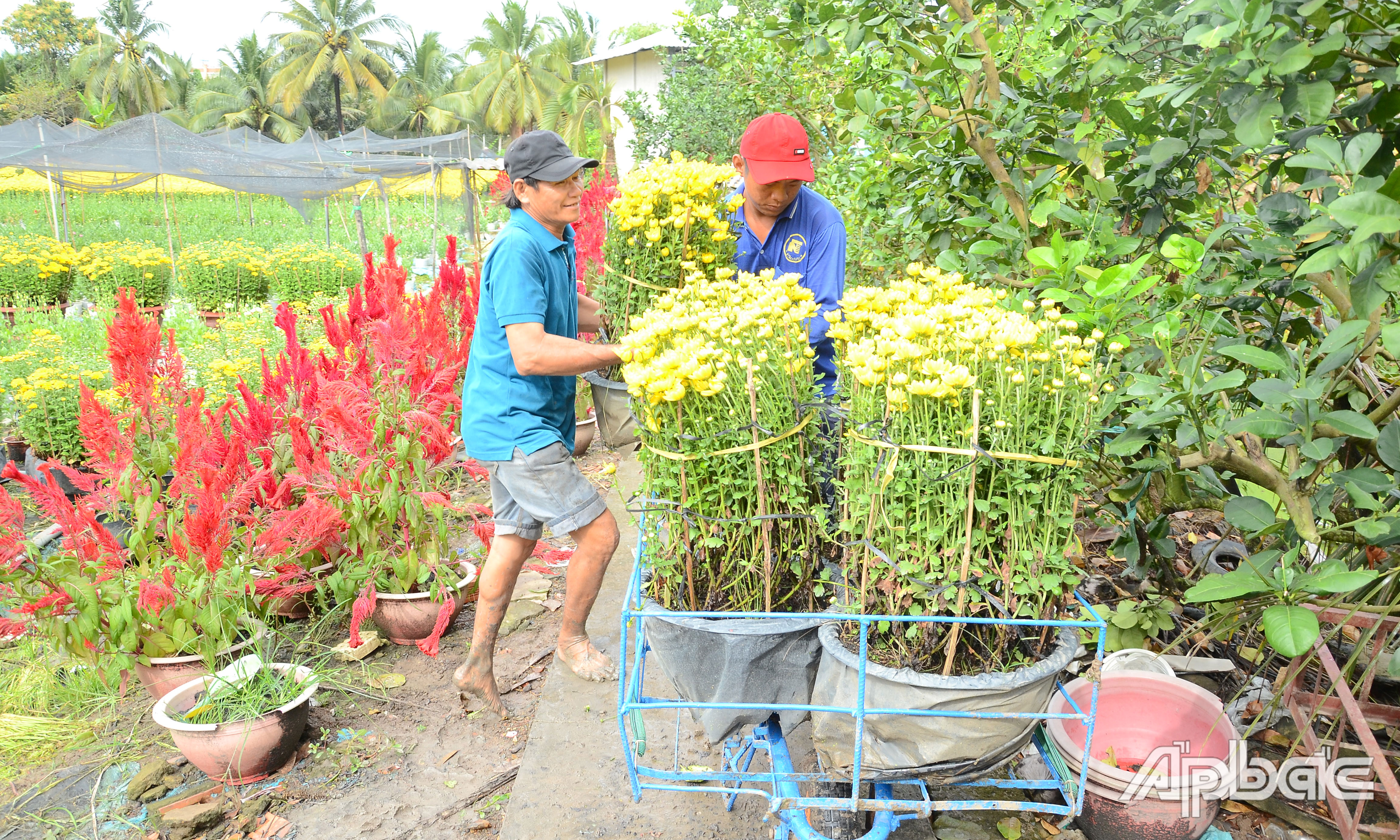 (ABO) Thời điểm này, các thương lái từ các tỉnh như: Bình Dương, Long An, Tây Ninh, TP. Hồ Chí Minh... đang tập trung đến nhà vườn tại TP. Mỹ Tho để lấy hoa tết đặt mua trước đó.
