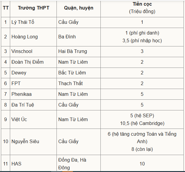 Với các trường còn lại, mức phí phổ biến 1-5 triệu đồng. Trường THPT Lý Thái Tổ tạm thời có mức thấp nhất, chỉ 1 triệu đồng phí ghi danh.