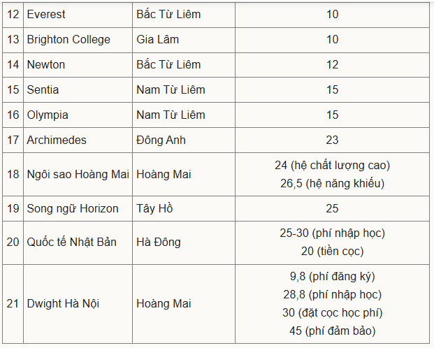 Nhiều trường khác có mức thu từ 10 triệu đồng, gồm Everest, Newton, Sentia, Olympia và Archimedes...
