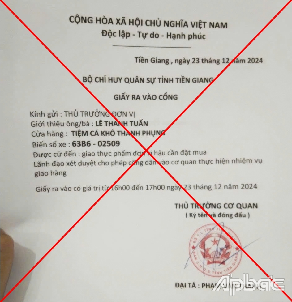Vụ thứ nhất, khoảng 16 giờ ngày 22-12-2024, có 1 đối tượng sử dụng thuê bao di động 0354712325 liên lạc đến Sạp khô Thanh - Phụng (Địa chỉ: Ki ốt 33, Trưng Trắc, phường 1, TP. Mỹ Tho, do anh Lê Thanh Tuấn, sinh năm 1980 làm chủ) tự xưng là: “Trần Ánh Nguyệt” là nhân viên nấu ăn thuộc Phòng Hậu cần - Bộ CHQS tỉnh Tiền Giang gửi yêu cầu kết bạn Zalo và đặt hàng 5 kg tôm khô, trị giá 2.250.000 đồng (có gửi kèm hình ảnh “Báo cáo kê mua hàng” và “Giấy ra vào cổng” giả con dấu, chữ ký của Đại tá Phạm Văn Thanh, Chỉ huy trưởng Bộ CHQS tỉnh), hẹn giao hàng lúc 16 giờ ngày 23-12-2024 tại cổng Bộ CHQS tỉnh (số 1, Hùng Vương, phường 1, TP. Mỹ Tho, tỉnh Tiền Giang).