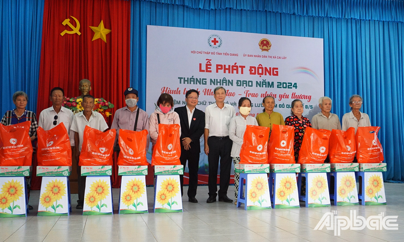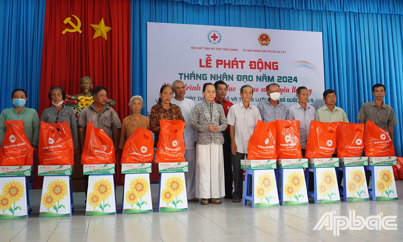 Bên cạnh đó, Hội Chữ thập đỏ tỉnh vận động tặng 100 phần quà cho người lao động khó khăn, hộ khó khăn, khuyết tật trên địa bàn TX. Cai Lậy.