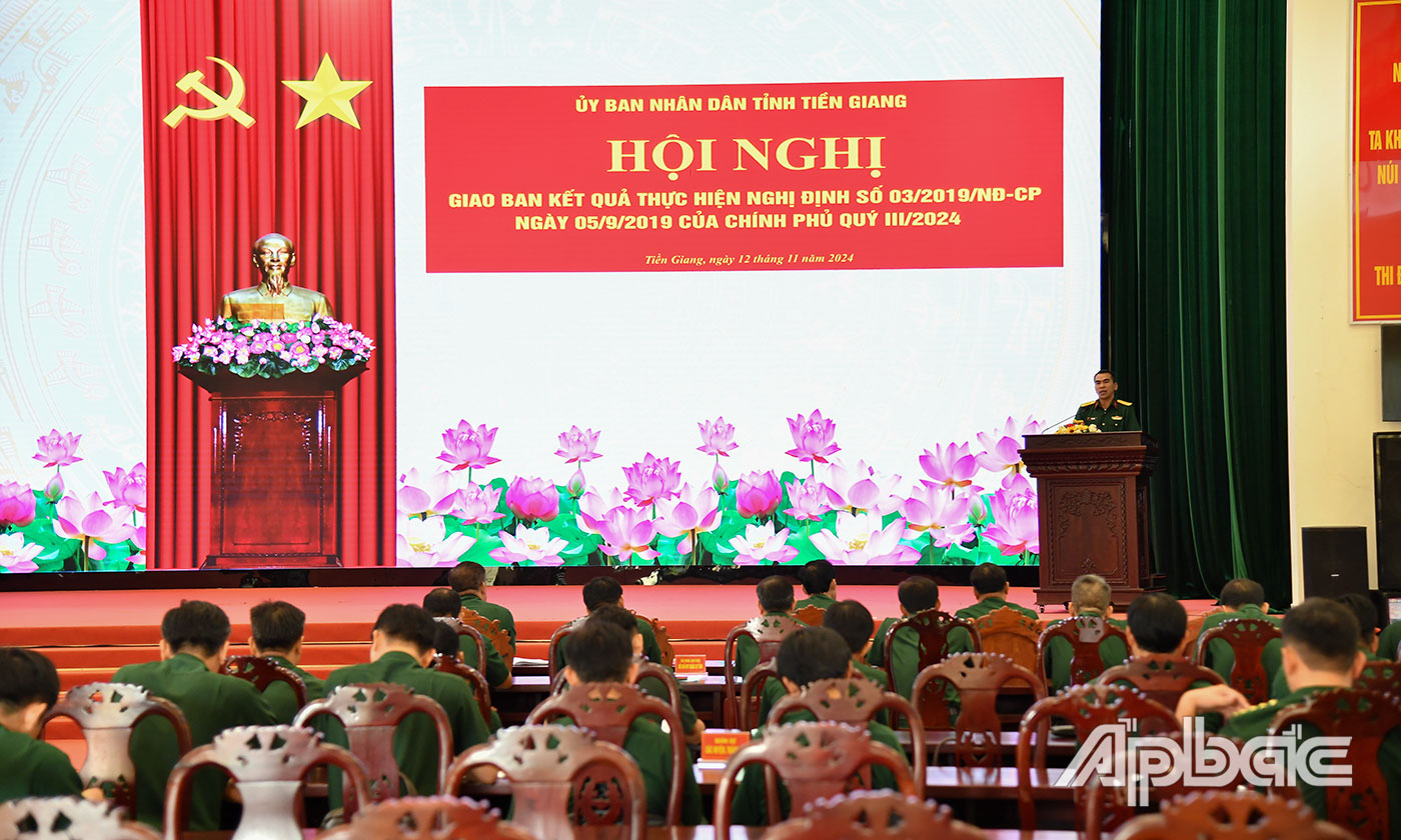 | Đại tá Võ Văn Năng, Phó Chỉ huy trưởng Bộ Chỉ huy Quân sự tỉnh Tiền Giang phát biểu tại hội nghị. |