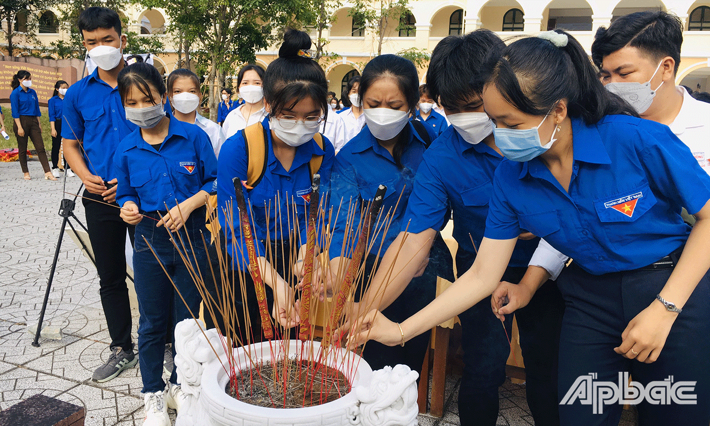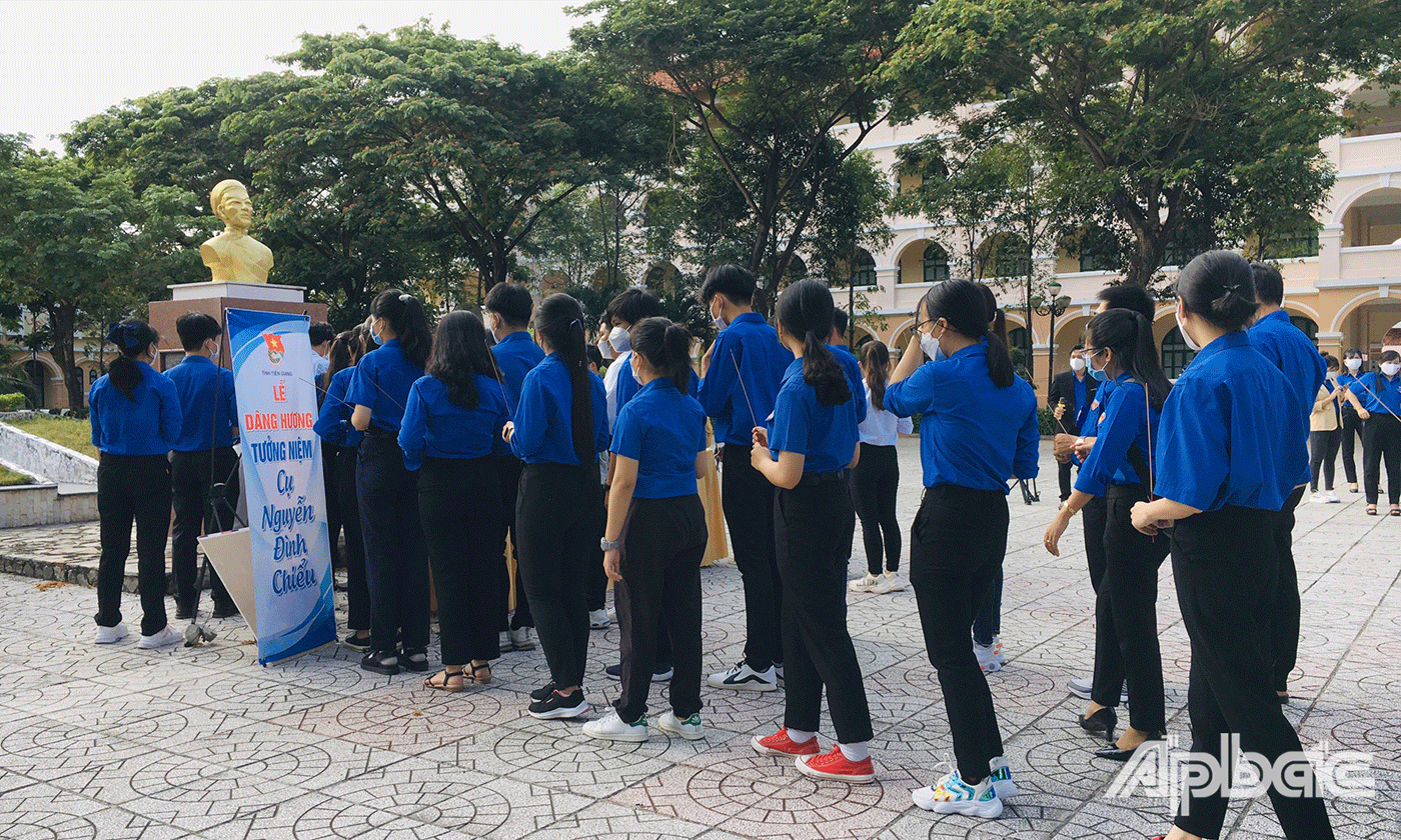 | Các đoàn viên, thanh niên tham gia dâng hương tưởng niệm cụ Nguyễn Đình Chiểu, tại Trường THPT Nguyễn Đình Chiểu. |