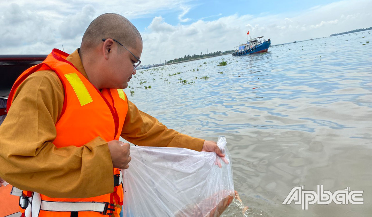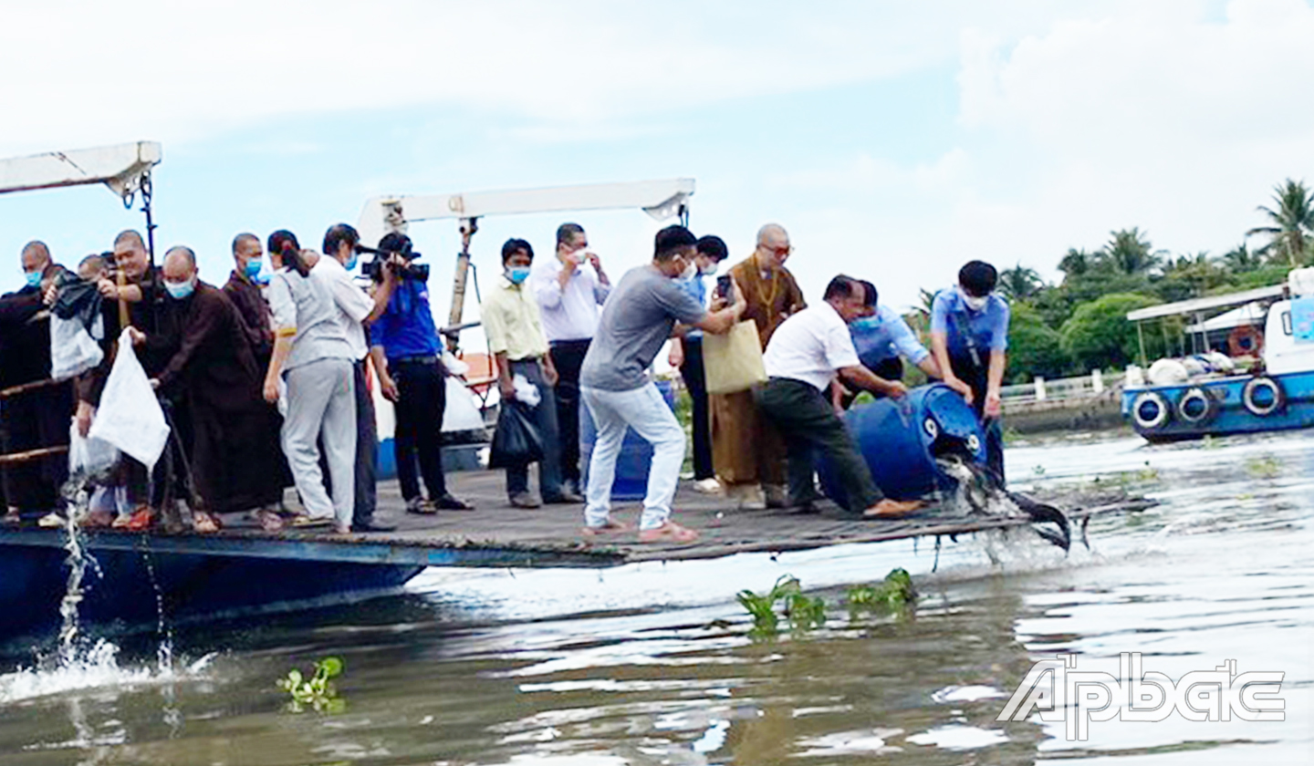 | Ban Trị sự Giáo hội Phật giáo tỉnh Tiền Giang thực hiện nghi thức phóng sinh theo nghi lễ Phật giáo trước khi thả cá giống về môi trường tự nhiên. |