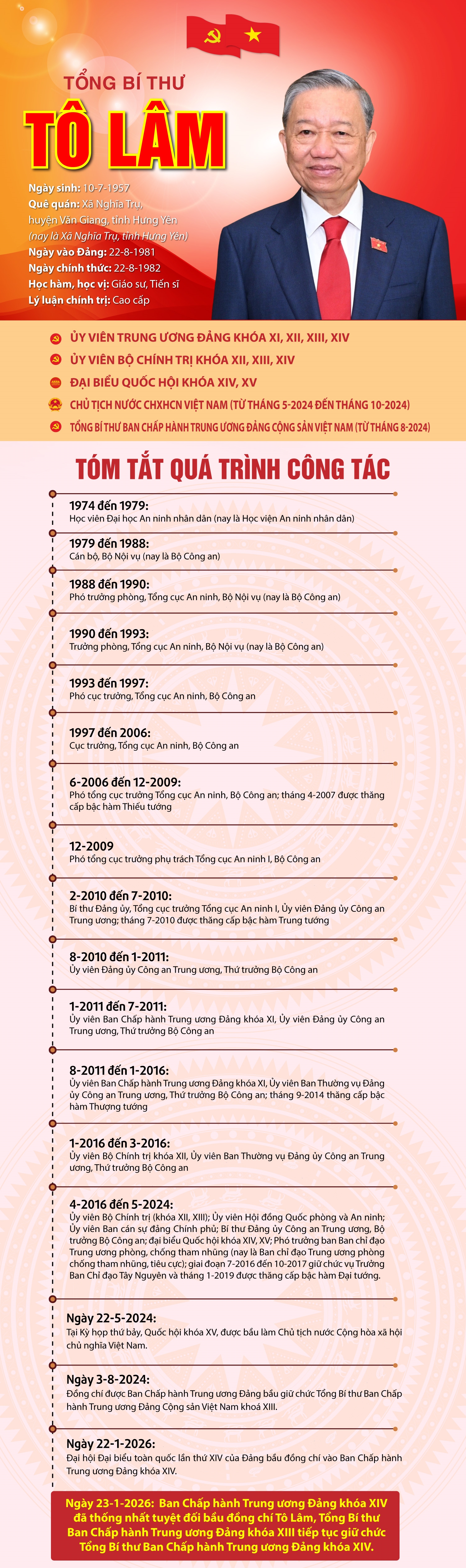 Ngày 23-1-2026, Ban Chấp hành Trung ương Đảng khóa XIV đã thống nhất tuyệt đối bầu đồng chí Tô Lâm, Tổng Bí thư Ban Chấp hành Trung ương Đảng khóa XIII tiếp tục giữ chức Tổng Bí thư Ban Chấp hành Trung ương Đảng khóa XIV.