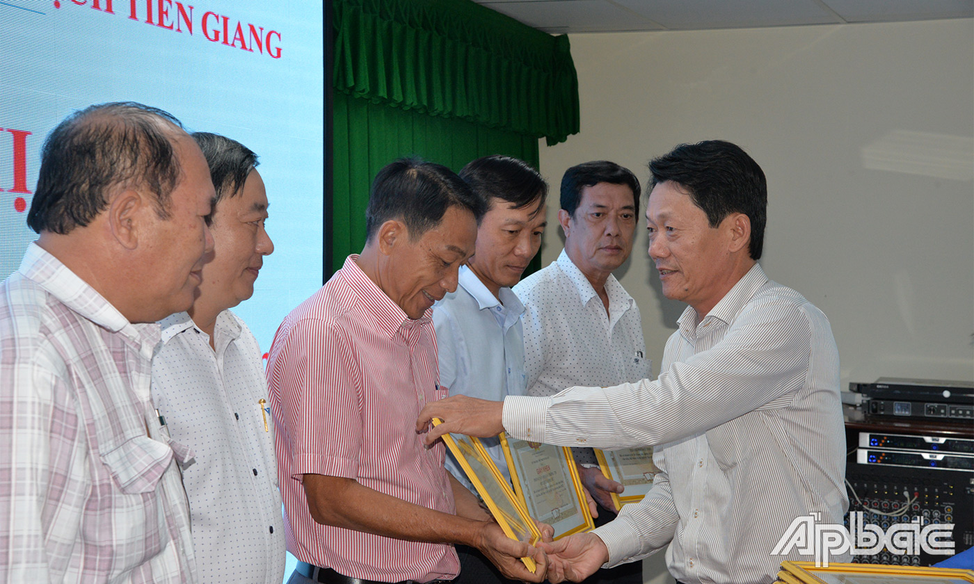 | Lãnh đạo Sở VHTTDL tỉnh Tiền Giang trao Giấy khen của Sở VHTTDL cho các tập thể tại hội nghị. |