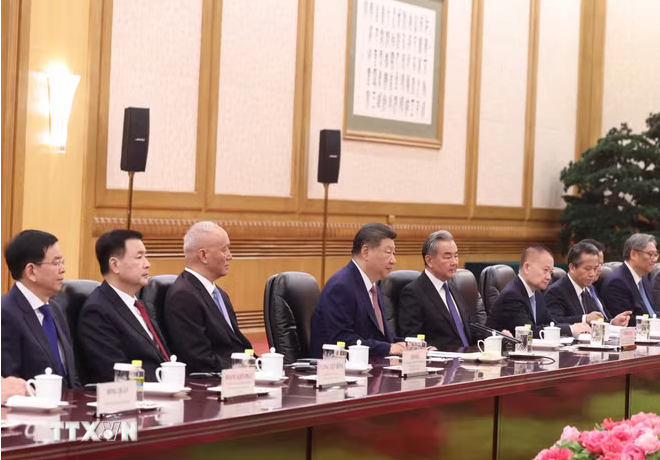 Hai nhà Lãnh đạo khẳng định trong bối cảnh phức tạp của tình hình quốc tế, hai Đảng, hai nước cần đoàn kết chặt chẽ, tăng cường tin cậy chiến lược, kết nối chính sách, thương mại, hạ tầng, năng lượng, tiếp tục làm sâu sắc, nâng tầm hơn quan hệ Việt Nam-Trung Quốc trong giai đoạn mới, đóng góp thiết thực cho hòa bình, hợp tác và phát triển của khu vực và trên thế giới.