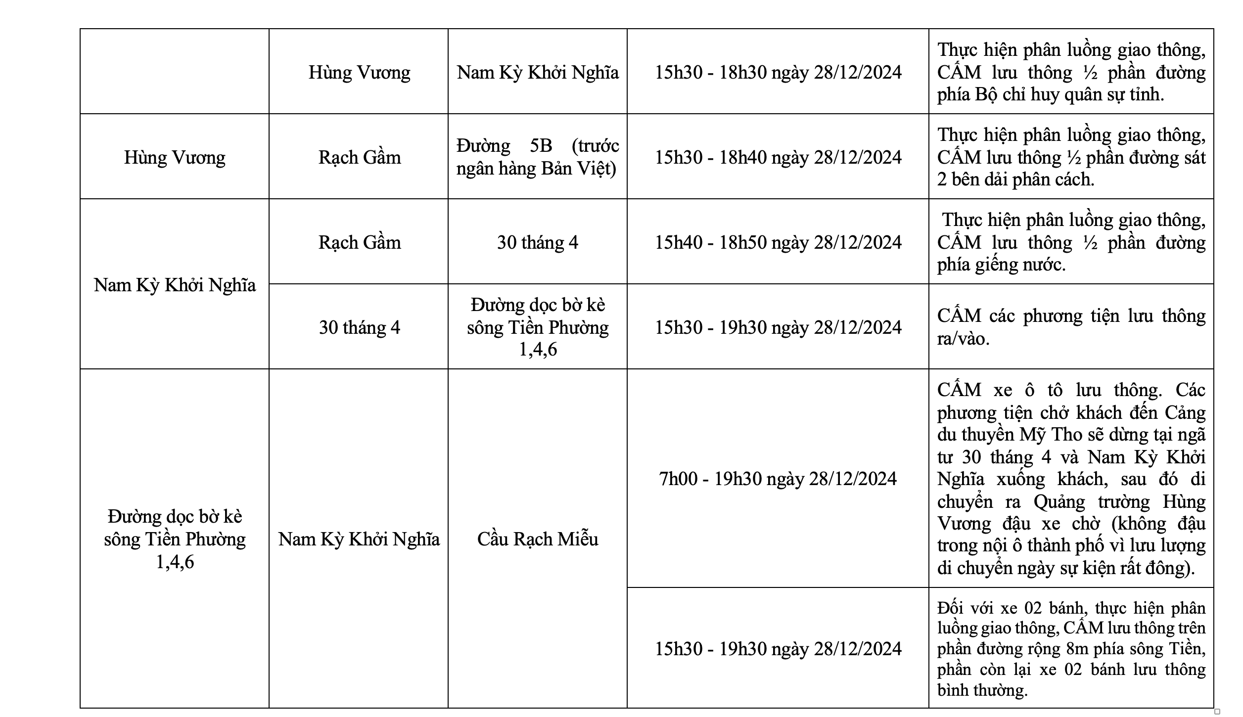 (ABO) Ngày 23-12, UBND TP. Mỹ Tho (tỉnh Tiền Giang) thông báo về việc hạn chế và cấm xe lưu thông qua một số tuyến đường khu vực trung tâm thành phố vào ngày 27 và 28-12 để phục vụ Giải bán Marathon TP. Mỹ Tho mở rộng “Mỹ Tho Sunset Run 2024”.