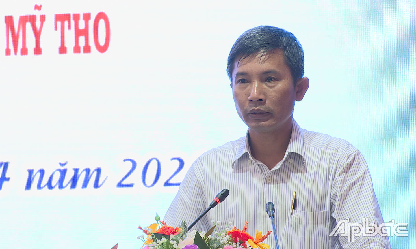 Đồng chí Trịnh Văn Lợi, Phó Bí thư Thường trực Thành ủy, Chủ tịch HĐND TP. Mỹ Tho phát biểu tại buổi tọa đàm. |