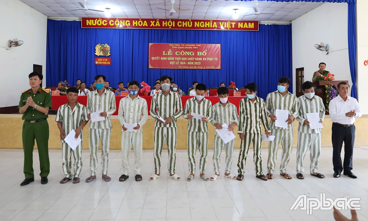 Tại buổi lễ, Tòa án nhân dân tỉnh Tiền Giang công bố quyết định giảm thời hạn chấp hành án phạt tù cho 348 phạm nhân, trong đó có 17 phạm nhân được giảm hết thời hạn chấp hành án phạt tù, giảm chung thân xuống 30 năm cho 2 phạm nhân, những phạm nhân còn lại giảm từ 1 tháng tù đến 23 tháng tù.