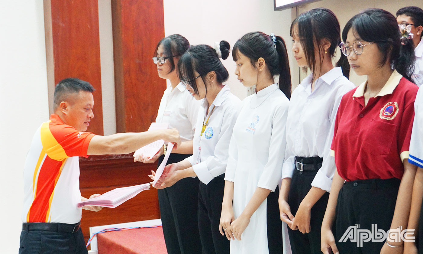| Đại diện Ngân hàng HDBank và Chủ tịch Hội Khuyến học tỉnh Tiền Giang Đồng Thị Bạch Tuyết trao học bổng cho học sinh nghèo có hoàn cảnh đặc biệt khó khăn. |