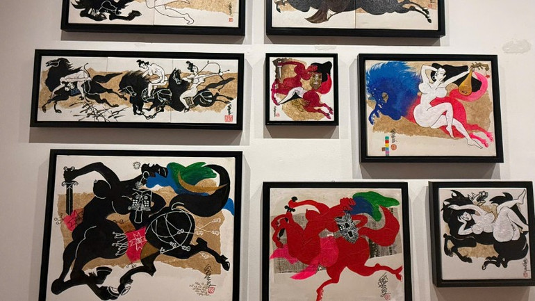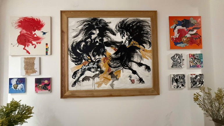 Triển lãm "Thánh Mã 2026" trưng bày hơn 100 tác phẩm mỹ thuật gồm tranh sơn mài, acrylic, tranh trên gỗ cổ, đĩa gốm, mâm gỗ...