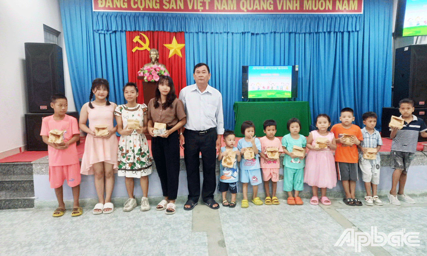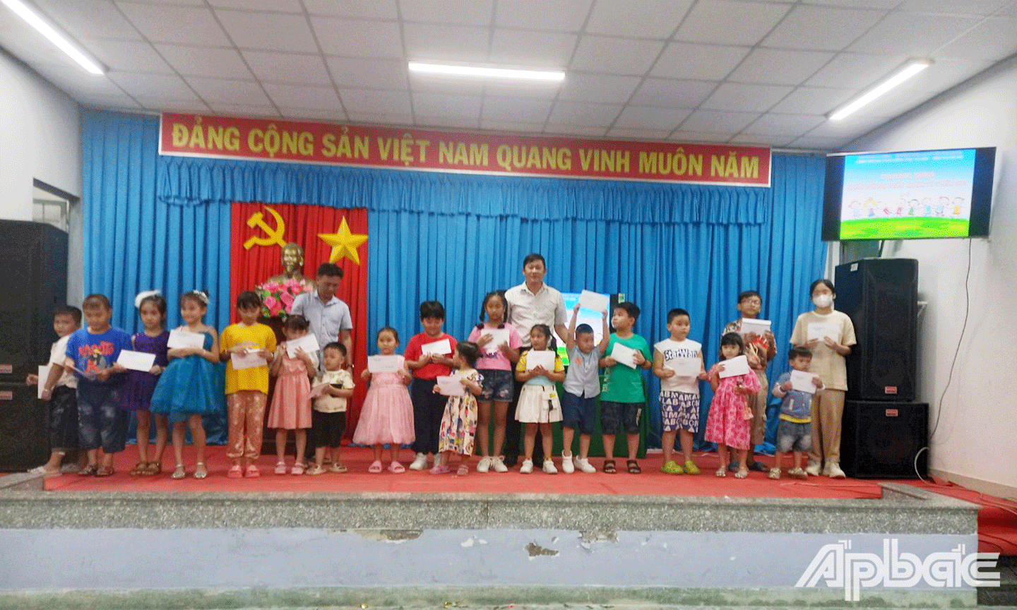 | Tặng thưởng cho các em thiếu nhi tại buổi họp mặt Ngày Quốc tế Thiếu nhi. |