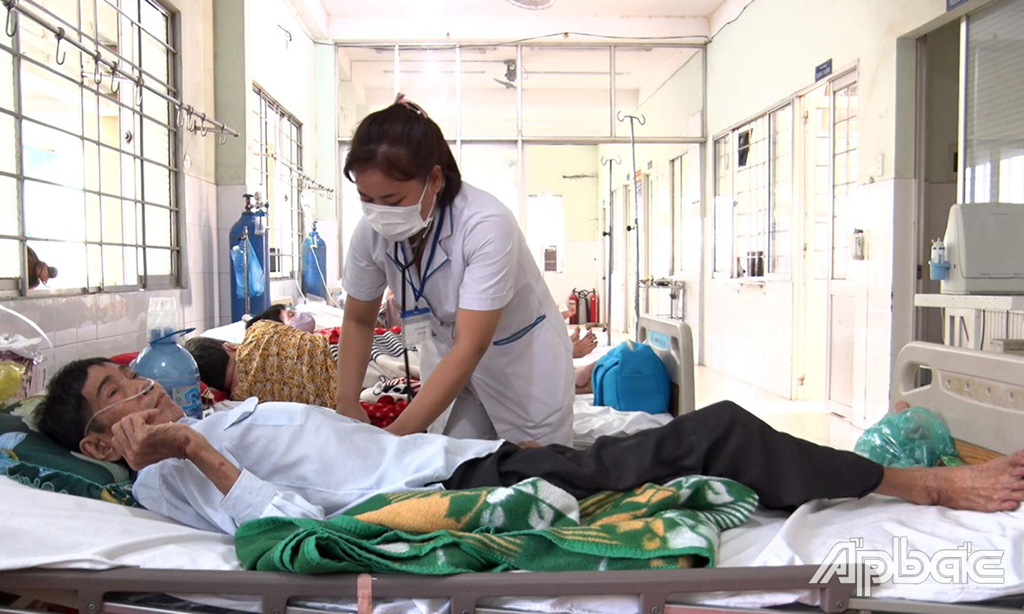 | Nhân viên y tế Trung tâm Y tế huyện Chợ Gạo thăm khám, chăm sóc bệnh nhân. |