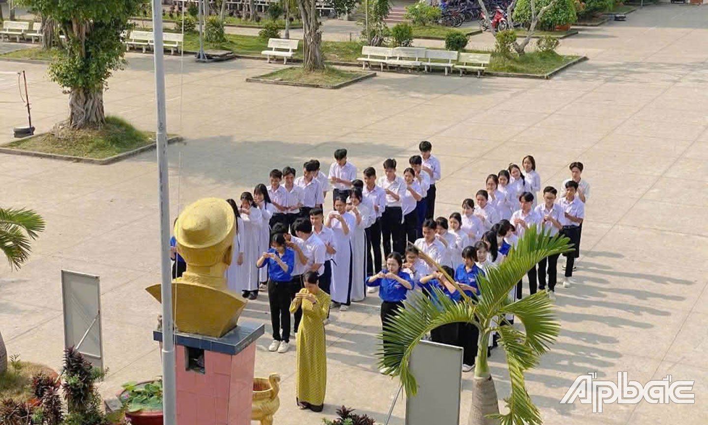 | Giáo viên và học sinh Trường THPT Thủ Khoa Huân, huyện Chợ Gạo. |