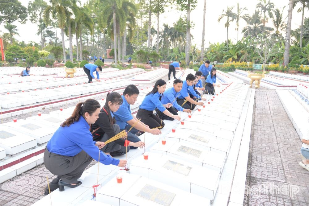 Trong không khí trang nghiêm và xúc động, các đồng chí lãnh đạo, đại biểu và đoàn viên, thanh niên đã thành kính dâng tràng hoa, dâng hương và dành một phút mặc niệm trước Tượng đài Tổ quốc ghi công; đồng thời đến từng phần mộ liệt sĩ thắp hương và thắp những ngọn nến thể hiện sự tri ân và lòng biết ơn vô hạn đối với các Anh hùng liệt sĩ – những người con ưu tú của quê hương đã anh dũng chiến đấu, hy sinh vì nền độc lập, tự do của Tổ quốc và cuộc sống bình yên của Nhân dân.