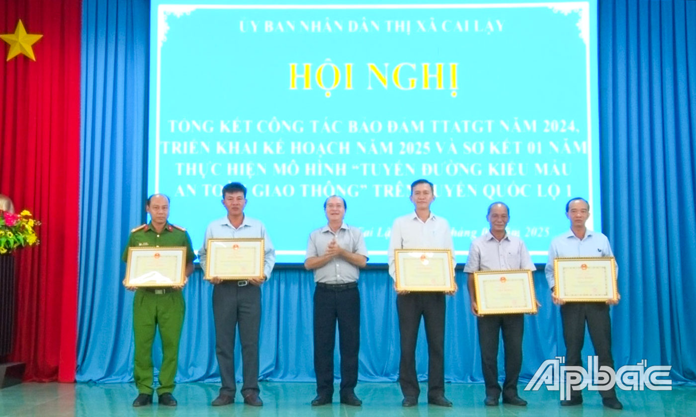 Dịp này UBND TX. Cai Lậy tặng Giấy khen cho 5 tập thể và 5 cá nhân có thành tích trong thực hiện chuyên đề thi đua “Bảo đảm trật tự, an toàn giao thông năm 2024” và phát động chuyên đề thi đua này năm 2025.