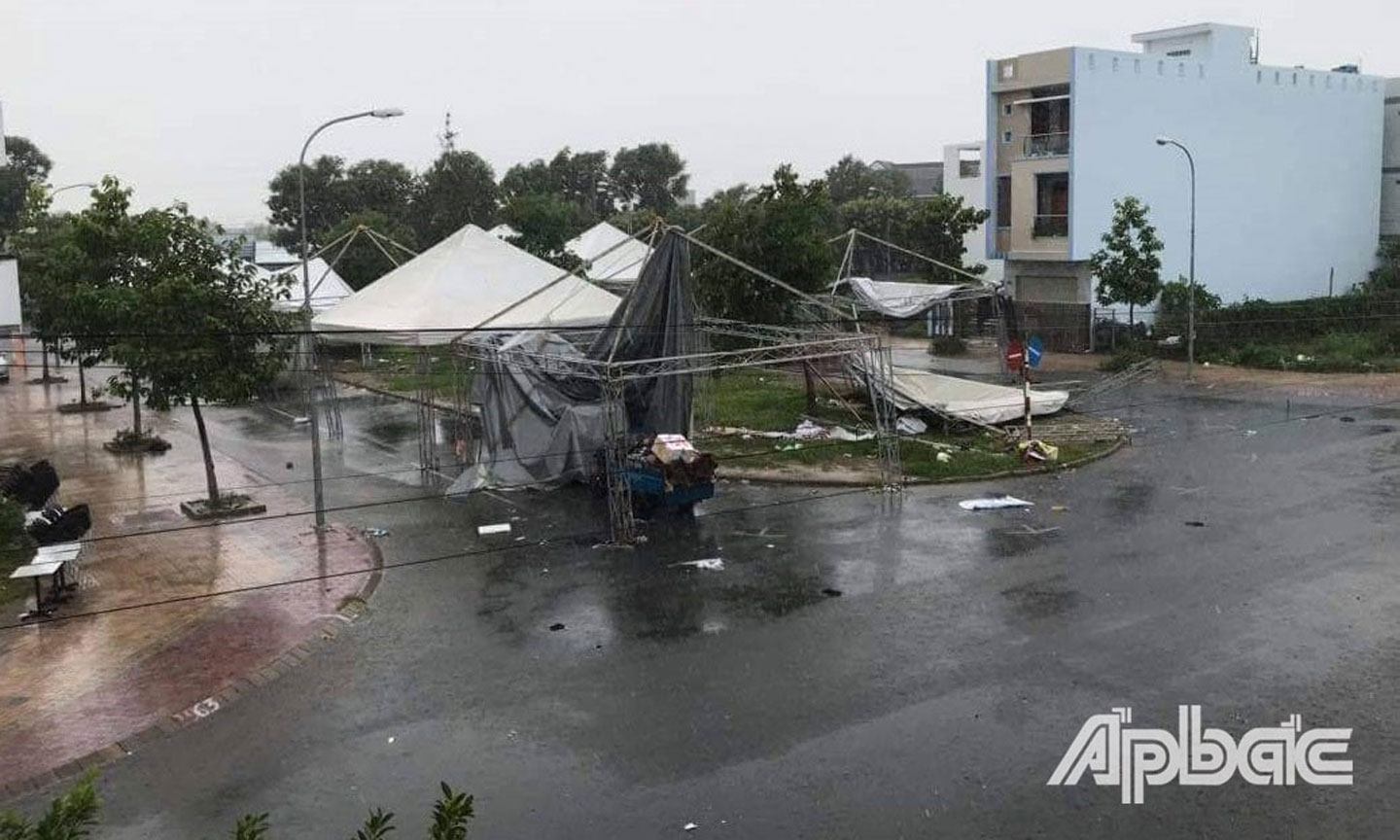 Theo ghi nhận, khoảng 13 giờ 30 phút cùng ngày, mưa lớn kèm giông lốc xuất hiện tại một số xã, phường ở TX. Gò Công, làm nhiều căn nhà bị tốc mái, mái che, đồ đạc của người dân bay ra đường, cây xanh bị đổ ngã đè lên đường dây điện…