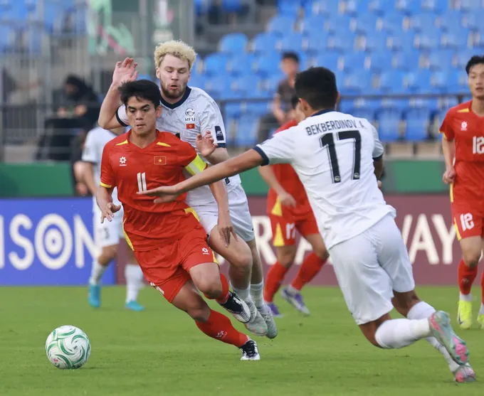 Dù chơi khá tốt trong phần lớn hiệp một, U23 Việt Nam vẫn không thể bảo toàn lợi thế dẫn bàn. Trước khi hiệp đấu khép lại, một pha chuyền bóng thiếu chính xác của Nguyễn Hiểu Minh đã mở ra cơ hội cho Murzakhmatov dứt điểm uy lực từ ngoài vòng cấm, ghim bóng thẳng vào góc cao khung thành của thủ môn Trần Trung Kiên.
