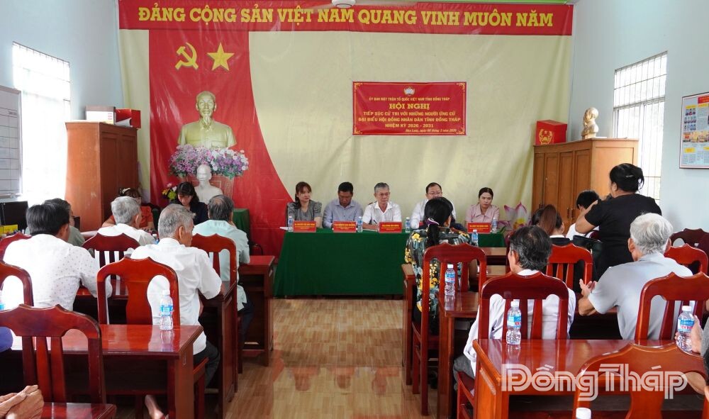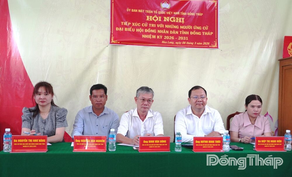 Tại hội nghị, cử tri được nghe thông tin về tiểu sử tóm tắt của các ứng cử viên đại biểu HĐND tỉnh nhiệm kỳ 2026 - 2031 đơn vị bầu cử số 12 gồm các đồng chí: Đinh Văn Dũng, Ủy viên Ban Thường vụ Tỉnh ủy, Phó Chủ tịch Thường trực Ủy ban Mặt trận Tổ quốc Việt Nam tỉnh Đồng Tháp; Huỳnh Minh Thức, Tỉnh ủy viên, Bí thư Đảng ủy, Chủ tịch HĐND xã Hòa Long; Nguyễn Văn Nghiệm, Phó Trưởng Phòng công tác HĐND, Văn phòng Đoàn đại biểu Quốc hội và HĐND tỉnh Đồng Tháp; Nguyễn Thị Như Hằng, Nhân viên Công ty TNHH Một thành viên Xổ số kiến thiết Đồng Tháp; Diệp Thị Ngọc Hiền, Viên chức Trạm Y tế xã Lai Vung.