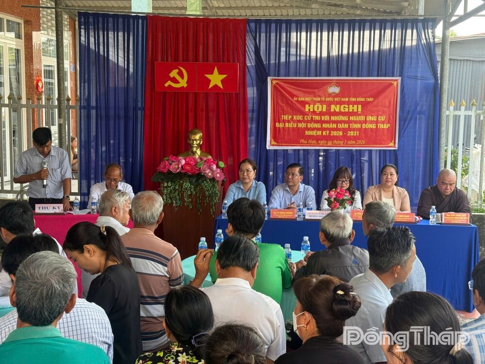 Tham dự buổi tiếp xúc có các ứng cử viên gồm: Tô Hoàng Khương, Trưởng ban Kinh tế - Ngân sách HĐND tỉnh Đồng Tháp; Lê Thị Phi Yến, Bí thư Đảng ủy, Chủ tịch HĐND xã Tân Nhuận Đông; Trần Thanh Bình (Thượng tọa Thích Tĩnh Triệt), Trưởng ban Trị sự Giáo hội Phật giáo Việt Nam tỉnh Đồng Tháp; Lê Hồng Hạnh, Phó Chánh Văn phòng Đảng ủy xã Phú Hựu và Trần Ngọc Hạnh, Trưởng phòng Tổ chức cán bộ, Tòa án nhân dân tỉnh Đồng Tháp.