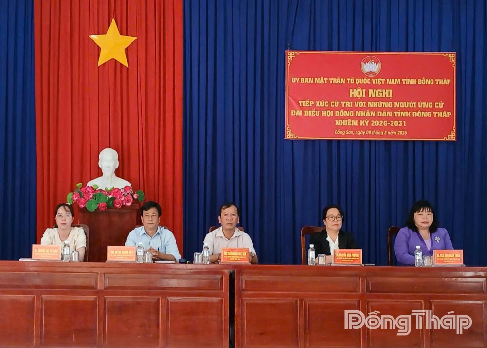 Tham dự buổi tiếp xúc có 5 ứng cử viên Đại biểu HĐND tỉnh nhiệm kỳ 2026 - 2031 gồm: Nguyễn Thị Mỹ Diễm, Tổ trưởng Tổ chuyên môn lá, Trường Mẫu giáo Đồng Thạnh, xã Đồng Sơn; Huỳnh Thanh Hiền, Phó Chánh Văn phòng Đoàn đại biểu Quốc hội tỉnh Đồng Tháp; Trần Hoàng Nhật Nam, Bí thư Đảng ủy xã Bình Ninh, tỉnh Đồng Tháp; Nguyễn Thị Bích Phượng, Ủy viên Thường vụ Hội Đông y - Ủy viên Thường vụ Hội Y học tỉnh Đồng Tháp; Thái Ngọc Bảo Trâm, Tỉnh ủy viên, Phó Chủ tịch Ủy ban Mặt trận Tổ quốc Việt Nam, Chủ tịch Hội Liên hiệp Phụ nữ tỉnh Đồng Tháp.