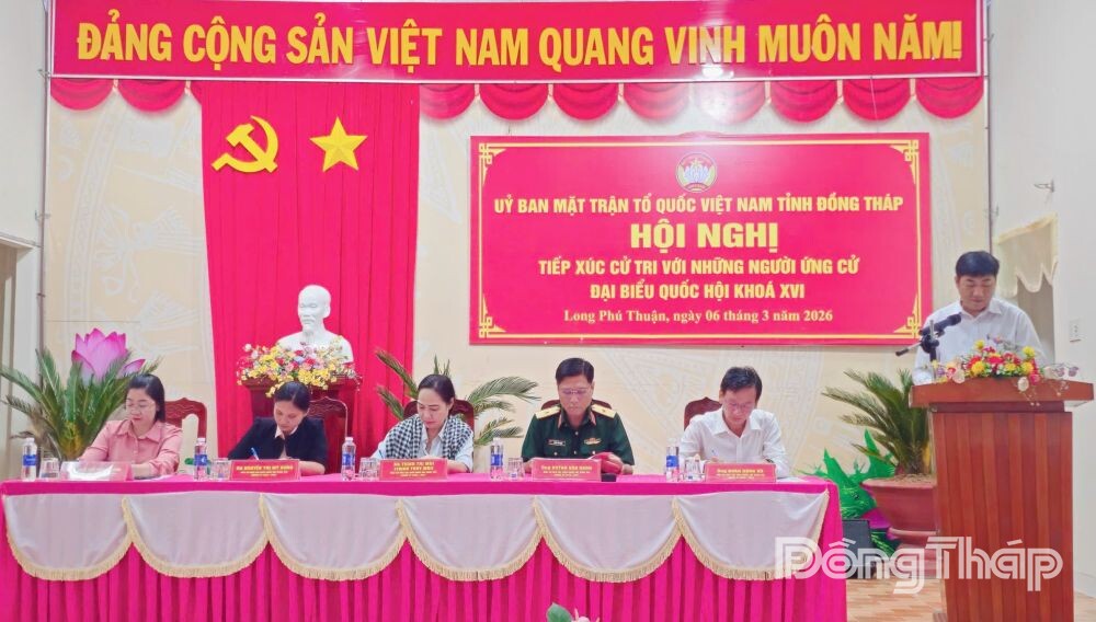 (ĐTO) Sáng 6-3, Ủy ban MTTQ Việt Nam tỉnh Đồng Tháp tổ chức Hội nghị tiếp xúc cử tri với những người ứng cử đại biểu Quốc hội khóa XVI đơn vị bầu cử số 1 trên địa bàn xã Long Phú Thuận để trình bày chương trình hành động, lắng nghe ý kiến, nguyện vọng của cử tri và vận động bầu cử.