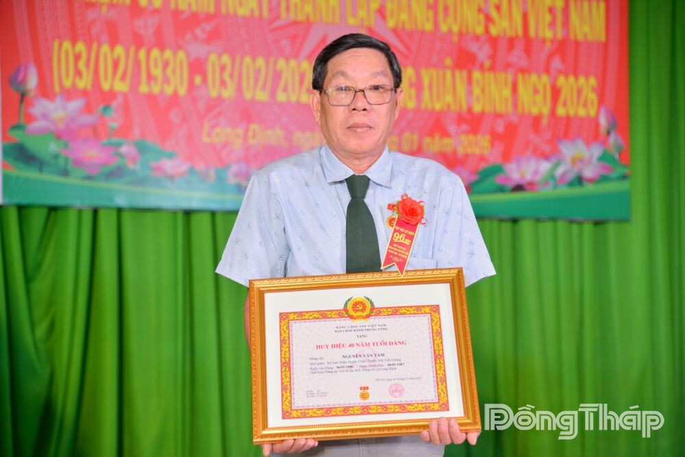 Đại diện các đồng chí nhận Huy hiệu 40 năm tuổi Đảng, đồng chí Nguyễn Văn Tám, đảng viên Chi bộ ấp Mới, bày tỏ niềm tự hào khi được Đảng ghi nhận chặng đường phấn đấu, rèn luyện và cống hiến.