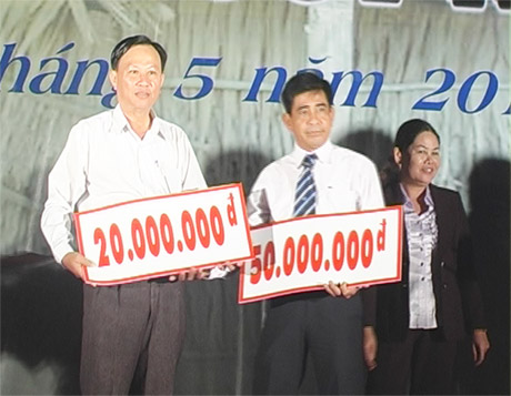 Trong đó, Ủy ban MTTQ tỉnh ủng hộ 50 triệu đồng; UBND và Ủy ban MTTQ huyện Cái Bè đóng góp 20 triệu đồng; Đại lý vé số Mai Hữu Ánh, tỉnh Vĩnh Long tặng 40 triệu đồng...