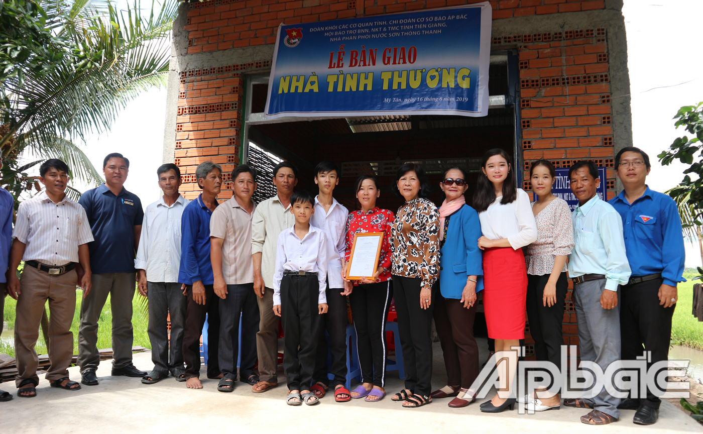 (ABO) - Ngày 16-8, Đoàn khối các cơ quan tỉnh, Chi đoàn cơ sở Báo Ấp Bắc phối hợp cùng Hội Bảo trợ bệnh nhân nghèo, người khuyết tật và trẻ mồ côi tỉnh, nhà phân phối nước sơn Thông Thanh bàn giao căn nhà tình thương cho gia đình chị Nguyễn Thị Cẩm, cư ngụ tại ấp 1, xã Mỹ Tân, huyện Cái Bè.