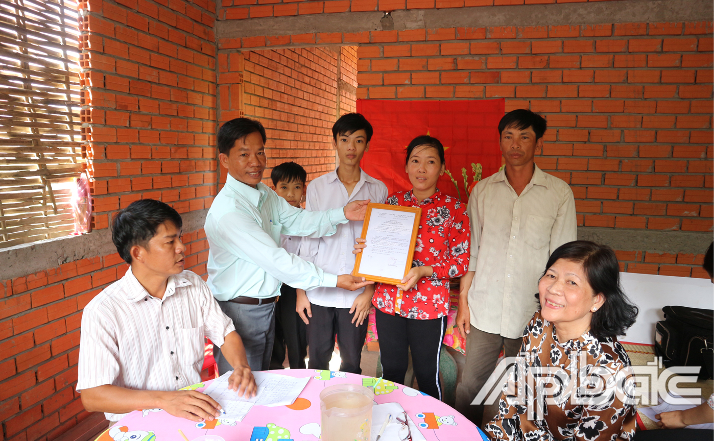 Phó Chủ tịch UBND xã Mỹ Tân trao quyết định bàn giao nhà cho gia đình chị Nguyễn Thị Cẩm |