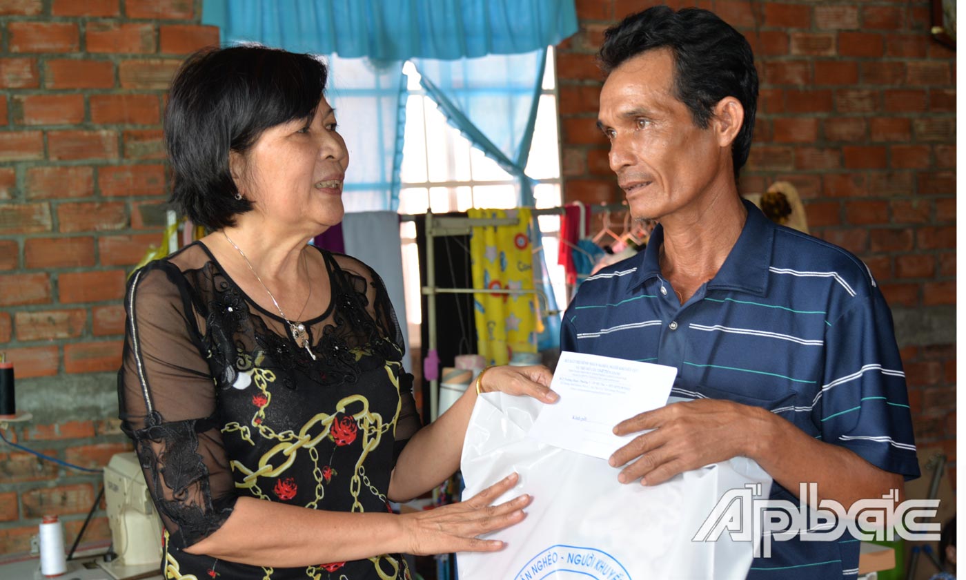 | Chủ tịch Hội Bảo trợ Võ Thị Chín trao quà cho người khuyết tật của TX. Cai Lậy. |