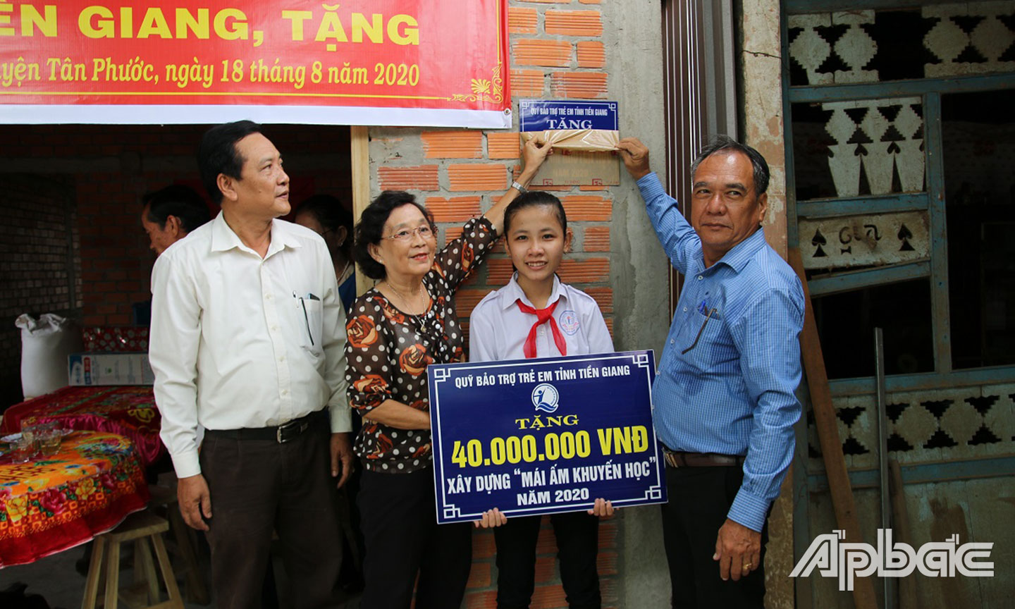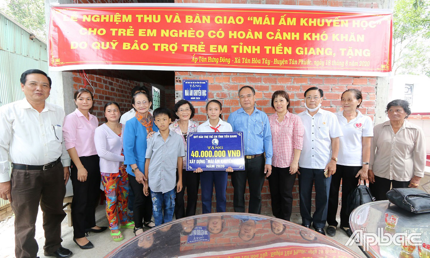 (ABO) Sáng 18-8, Quỹ Bảo trợ trẻ em tỉnh Tiền Giang phối hợp với Hội Khuyến học tỉnh tổ chức nghiệm thu và bàn giao Mái ấm khuyến học cho học sinh khó khăn về nhà ở tại xã Tân Hòa Tây, huyện Tân Phước. Phó Giám đốc Sở Lao động - Thương binh và Xã hội Phan Thanh Vân, Chủ tịch Hội Khuyến học tỉnh Tiền Giang Đồng Thị Bạch Tuyết cùng đến dự.