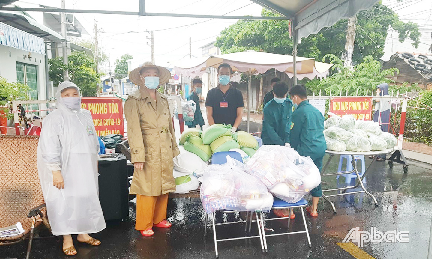 Ngoài ra, Ban Trị sự Phật giáo TP. Mỹ Tho còn gửi những món quà là thực phẩm để góp thêm vào bữa ăn của lực lượng làm nhiệm vụ tại các chốt phong tỏa.