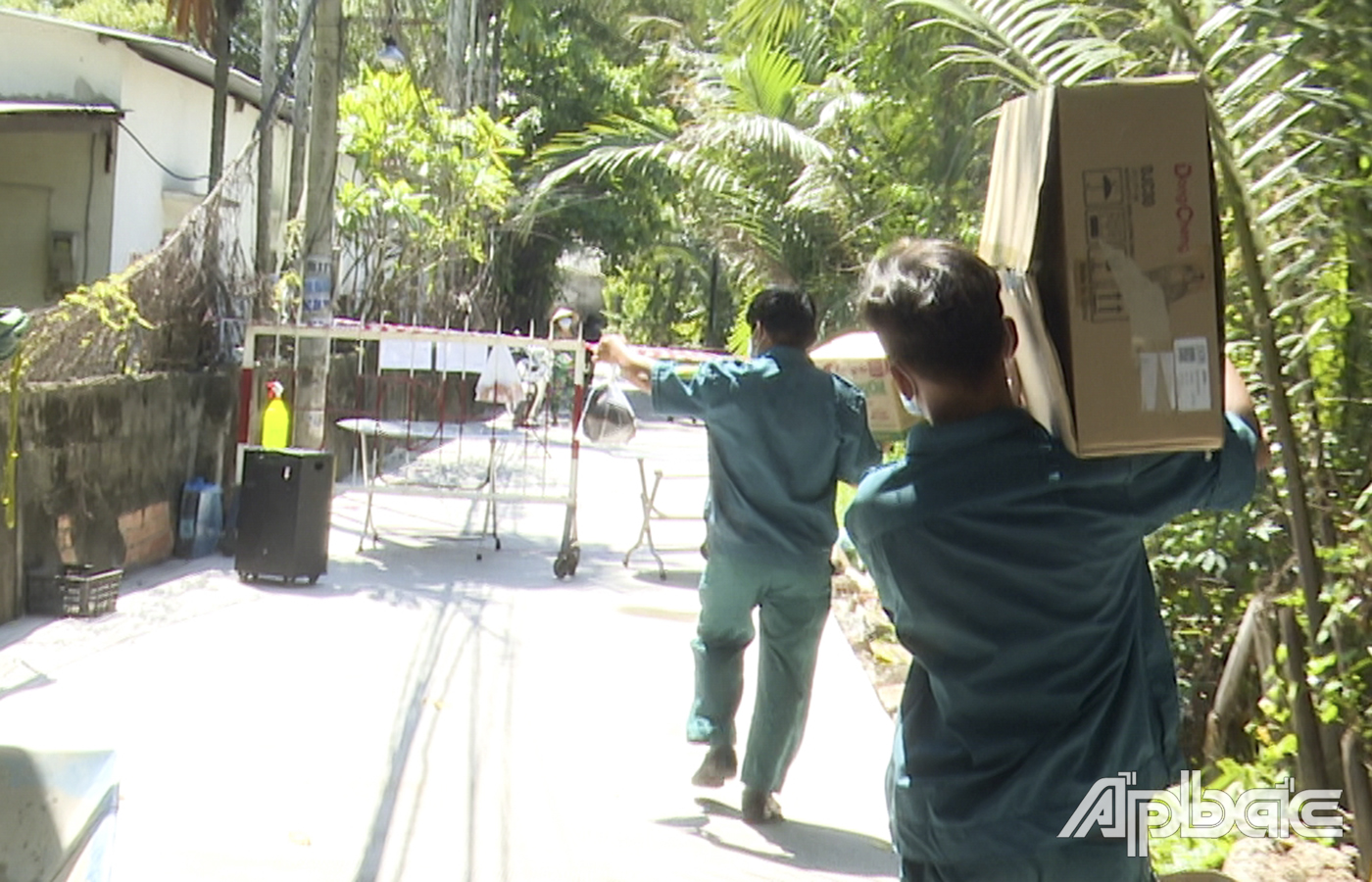 | Các lực lượng xã Tân Mỹ Chánh vận chuyển thực phẩm, nhu yếu phẩm cho người dân tổ 6, ấp Phong Thuận. |