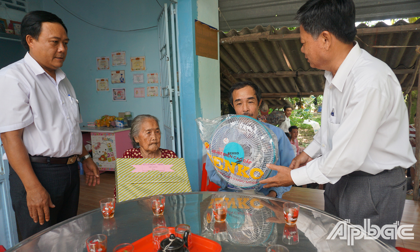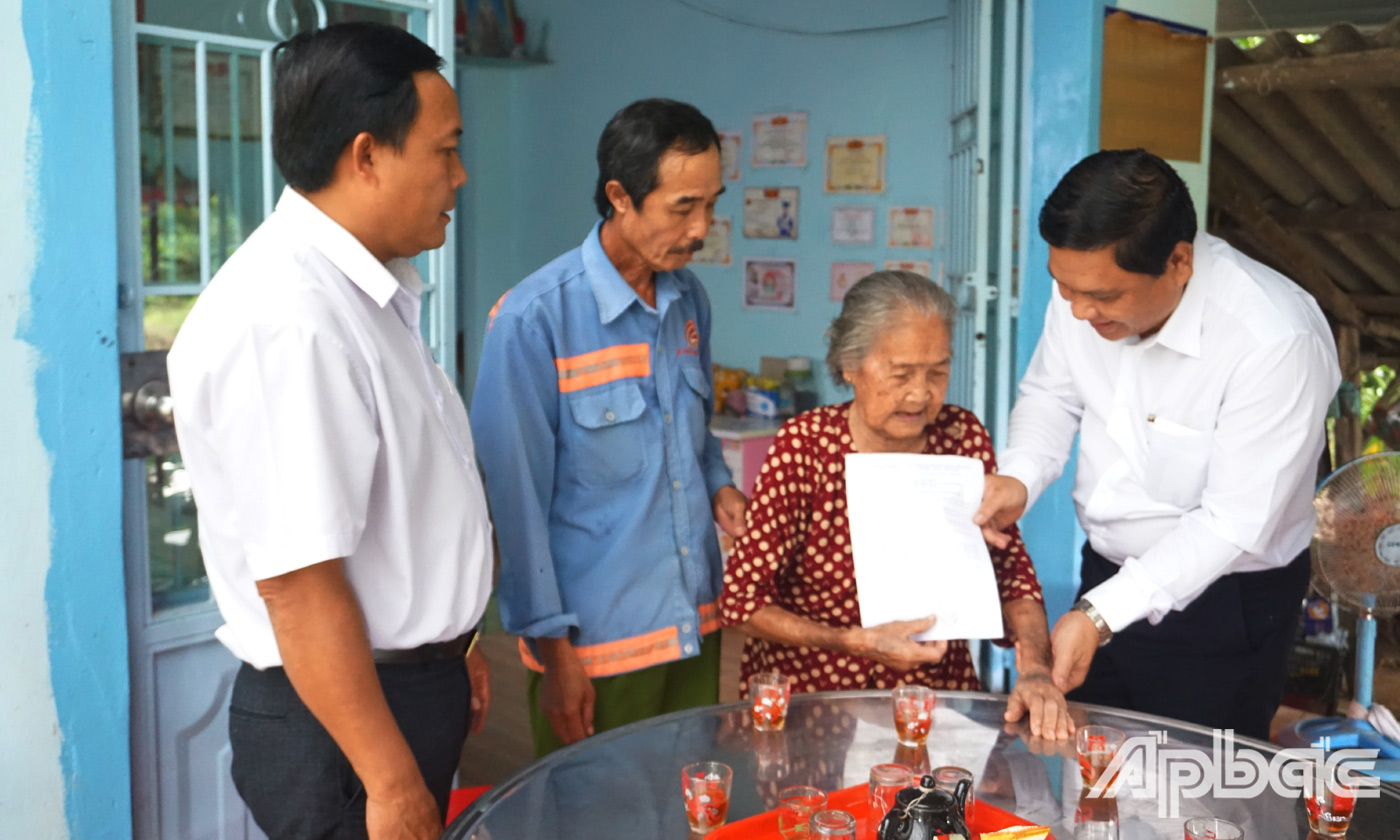 | Đồng chí Lý Văn Cẩm, Tỉnh ủy viên, Giám đốc Sở Lao động - Thương binh và Xã hội tỉnh Tiền Giang trao Quyết định trao tặng nhà tình nghĩa cho bà Võ Thị Hạnh, con liệt sĩ, ngụ ấp 2, xã Tân Thanh. |