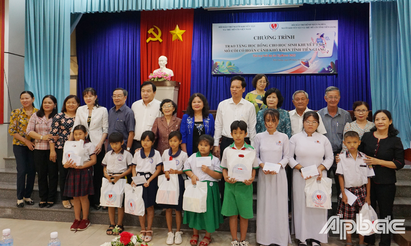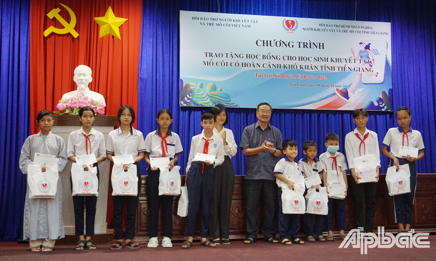 (ABO) Sáng 9-4, Hội Bảo trợ người khuyết tật và trẻ mồ côi Việt Nam phối hợp với Hội Bảo trợ bệnh nhân nghèo, người khuyết tật và trẻ mồ côi tỉnh Tiền Giang tổ chức chương trình trao tặng học bổng cho học sinh khuyết tật, mồ côi có hoàn cảnh khó khăn tại tỉnh Tiền Giang.