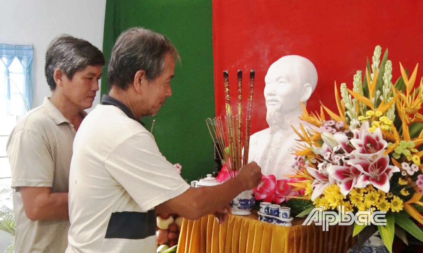 | Lãnh đạo HĐND huyện Cái Bè và UBND xã An Cư thắp hương tưởng niệm Bác. |