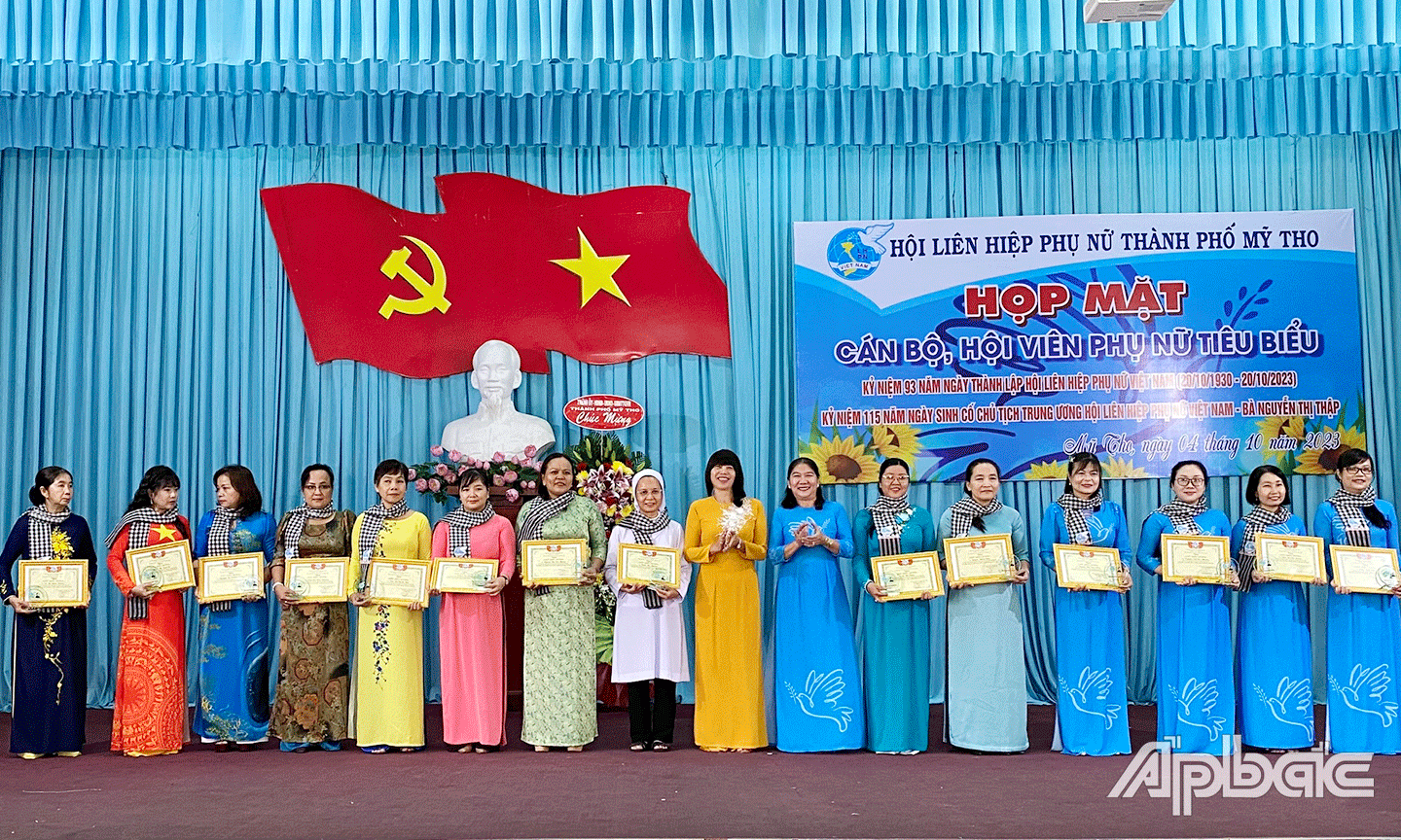 | Lãnh đạo UBND TP. Mỹ Tho và Hội Liên hiệp Phụ nữ thành phố biểu dương cán bộ, hội viên phụ nữ có thành tích tiêu biểu. Ảnh: Cẩm Linh |