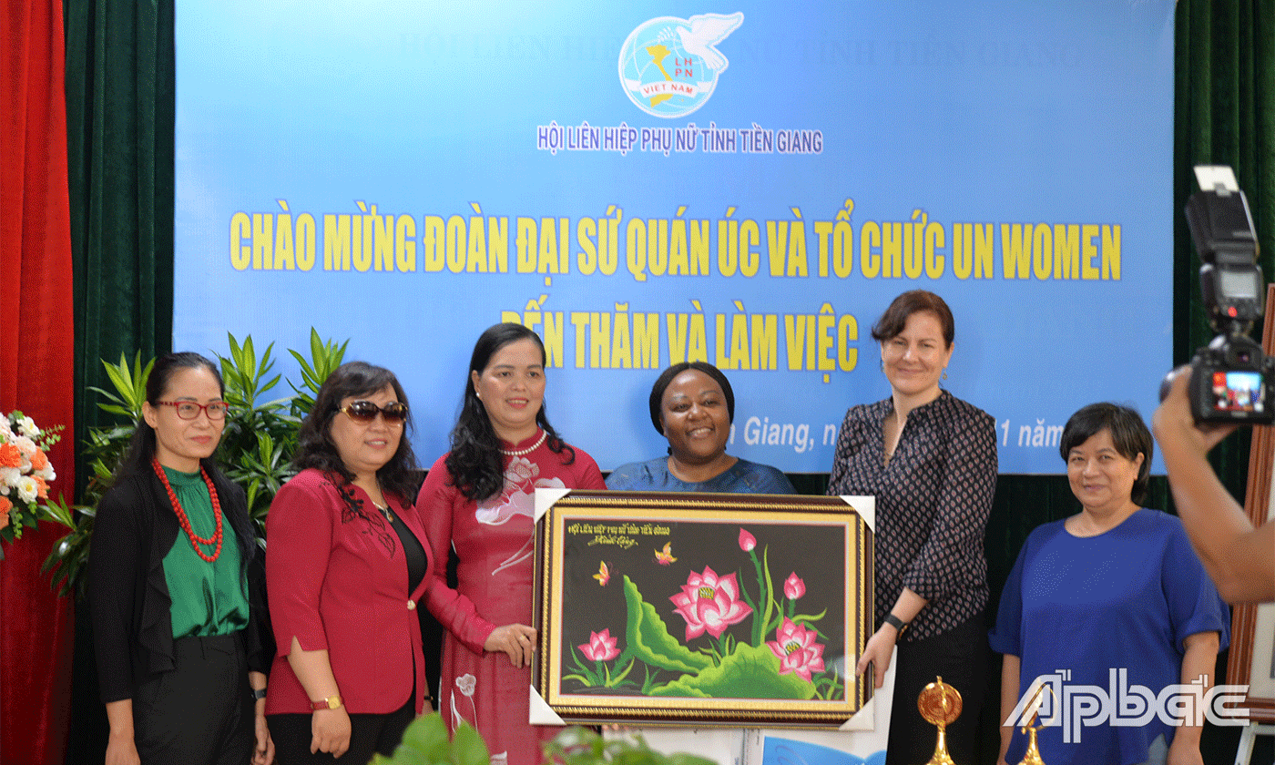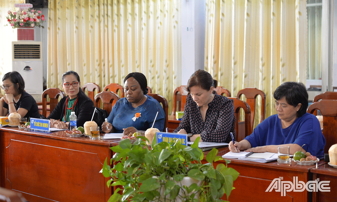 Đi cùng đoàn có bà Thân Thị Thiên Hương, Chuyên gia giới, Đại sứ quán Úc tại Việt Nam; bà Caroline T.Nyamayemombe, quyền Trưởng đại diện Tổ chức UN Women tại Việt Nam. Tiếp và là việc với có Chủ tịch Hội LHPN tỉnh Tiền Giang Nguyễn Thị Kim Phượng và các cán bộ Hội LHPN tỉnh