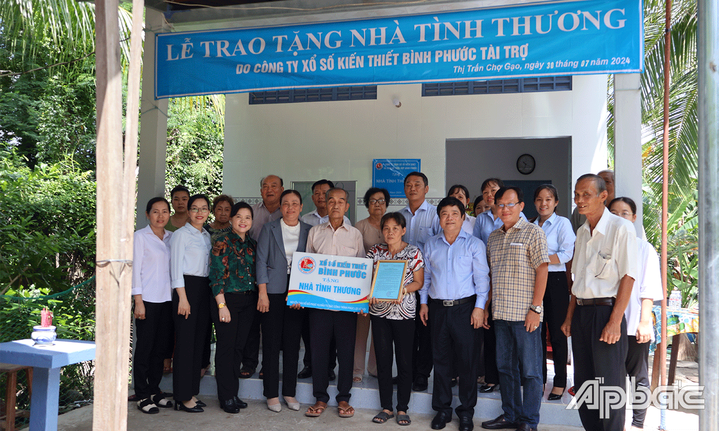(ABO) Ngày 30-7, Công ty TNHH MTV Xổ số kiết thiết và Dịch vụ tổng hợp Bình Phước phối hợp với Hội Liên hiệp Phụ nữ thị trấn Chợ Gạo, huyện Chợ Gạo, tỉnh Tiền Giang bàn giao Mái ấm tình thương cho hộ bà Lê Thị Triều, cư ngụ khu 3, là hộ nghèo.